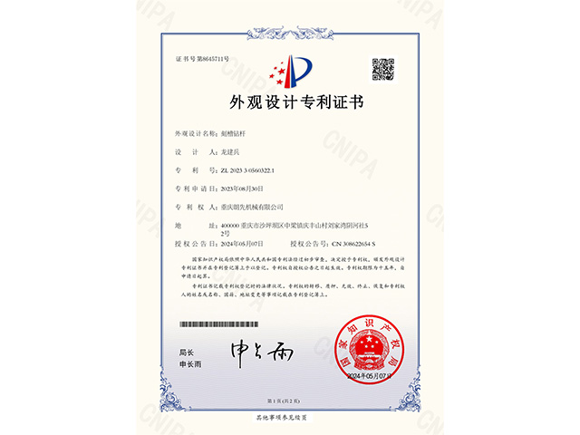 刻槽钻杆-外观设计专利证书-1